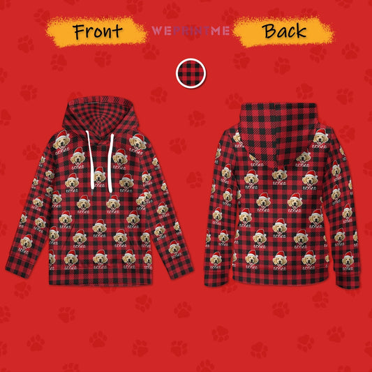 Custom Pet Face&Name Santa Hat Red Plaid Hoodies For Kids